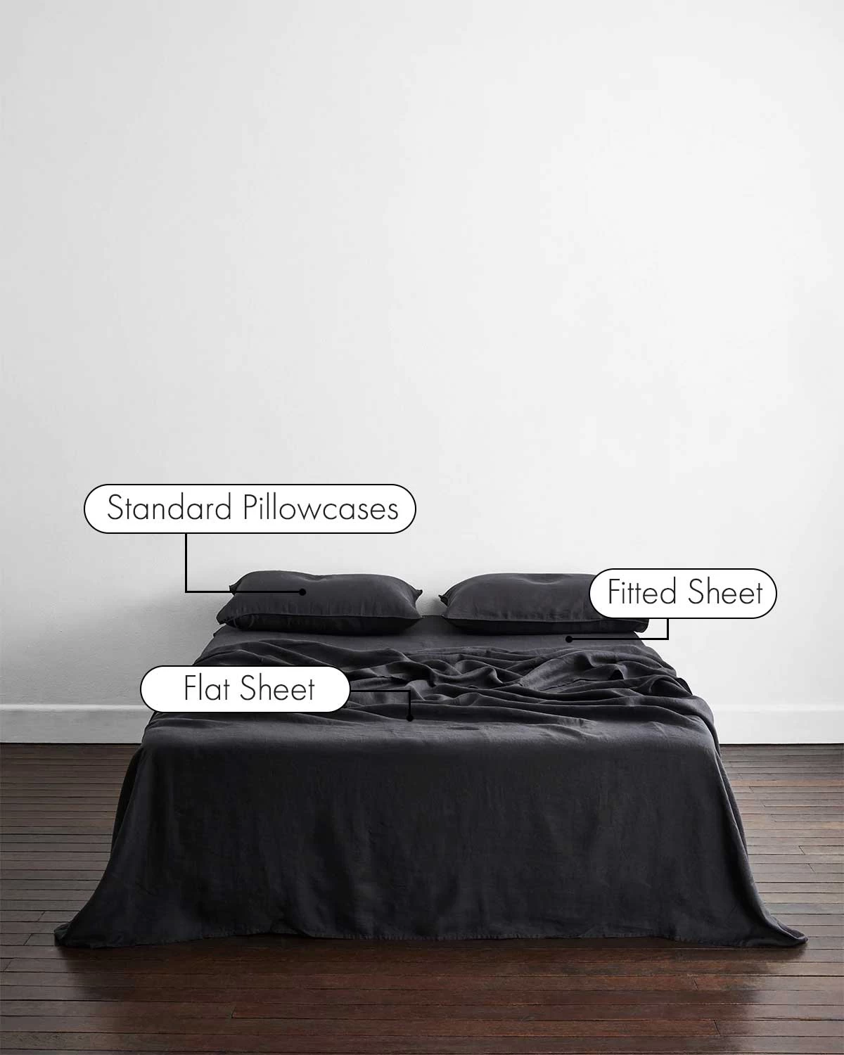 Buttery soft, pre-washed and designed to last, our 100% French flax linen sheet set in Charcoal includes two pillowcases, a flat sheet and a fitted sheet. Perfect for those who prefer to sleep without a duvet cover, or simply love a layered linen-clad bed.