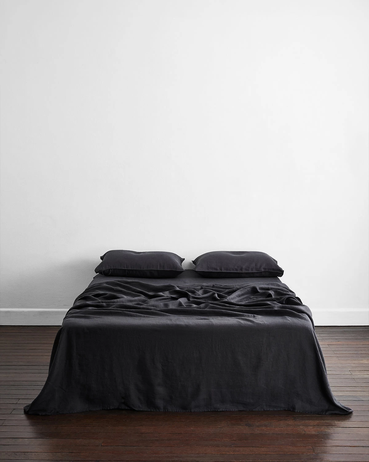 Ultra soft and incredibly durable, our 100% French flax linen flat sheet in Charcoal is a versatile addition to your collection. Generously sized to just graze the floor, these sheets serve as lightweight covers on their own, or as a luxurious extra layer alongside other linen pieces.