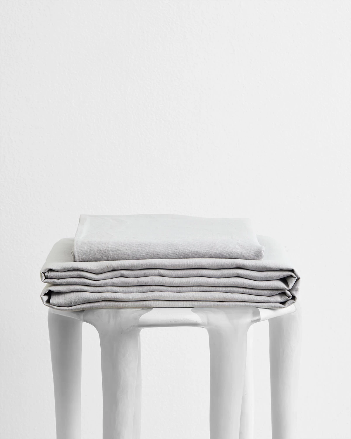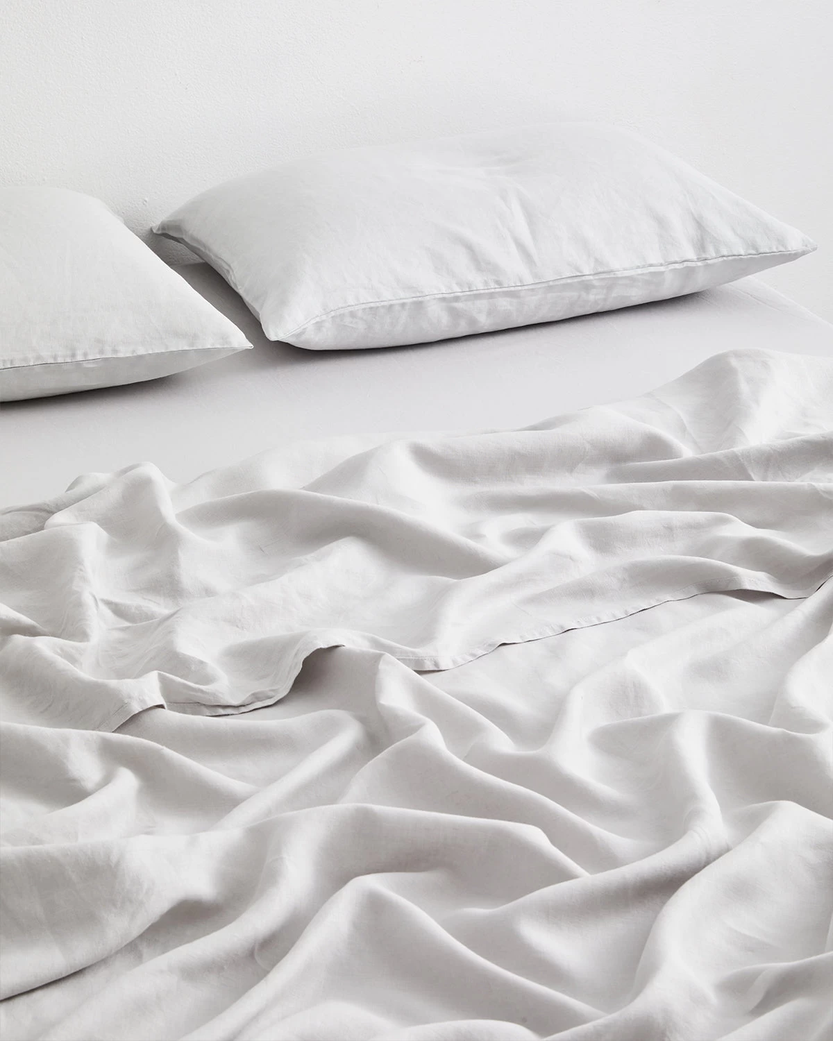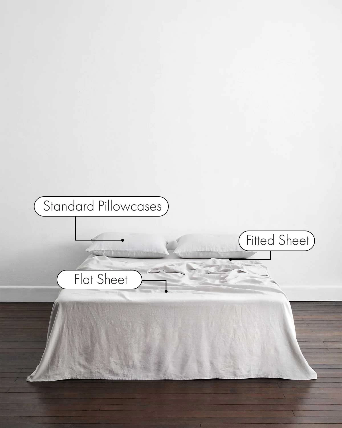 Buttery soft, pre-washed and designed to last, our 100% French flax linen sheet set in Fog includes two pillowcases, a flat sheet and a fitted sheet. Perfect for those who prefer to sleep without a duvet cover, or simply love a layered linen-clad bed.
