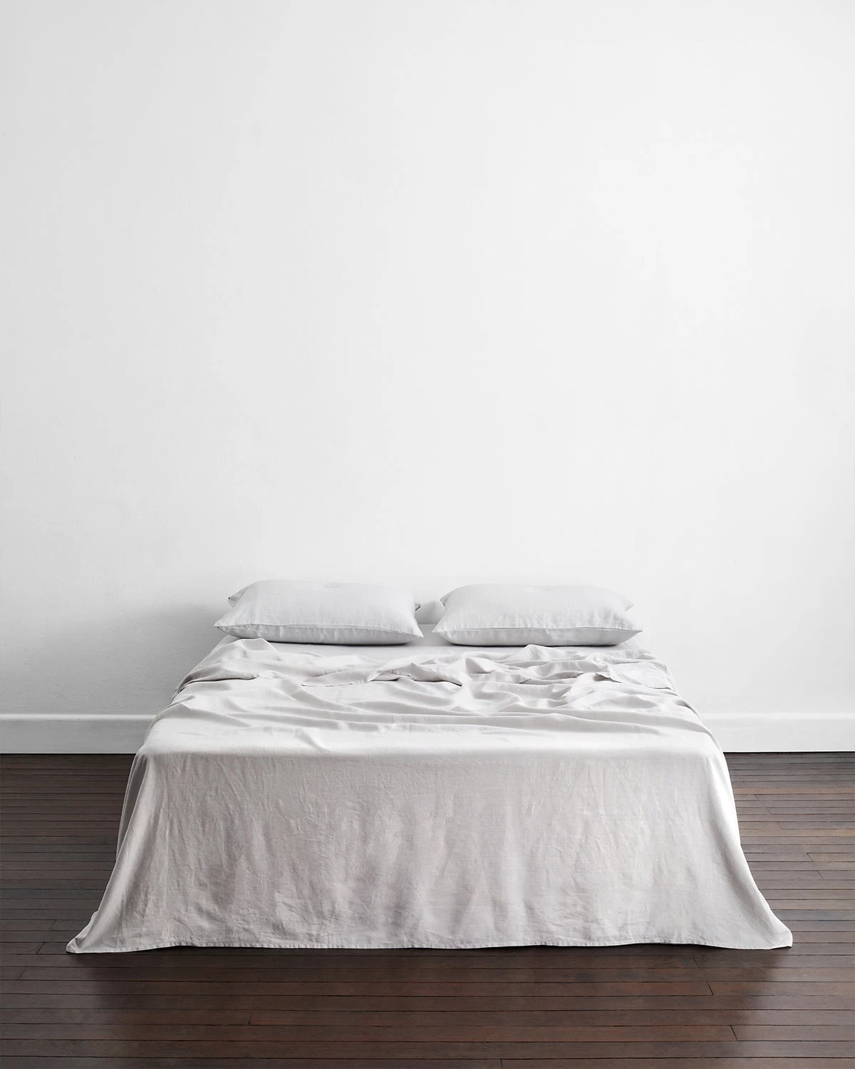 Ultra soft and incredibly durable, our 100% French flax linen flat sheet in Fog is a versatile addition to your collection. Generously sized to just graze the floor, these sheets serve as lightweight covers on their own, or as a luxurious extra layer alongside other linen pieces.