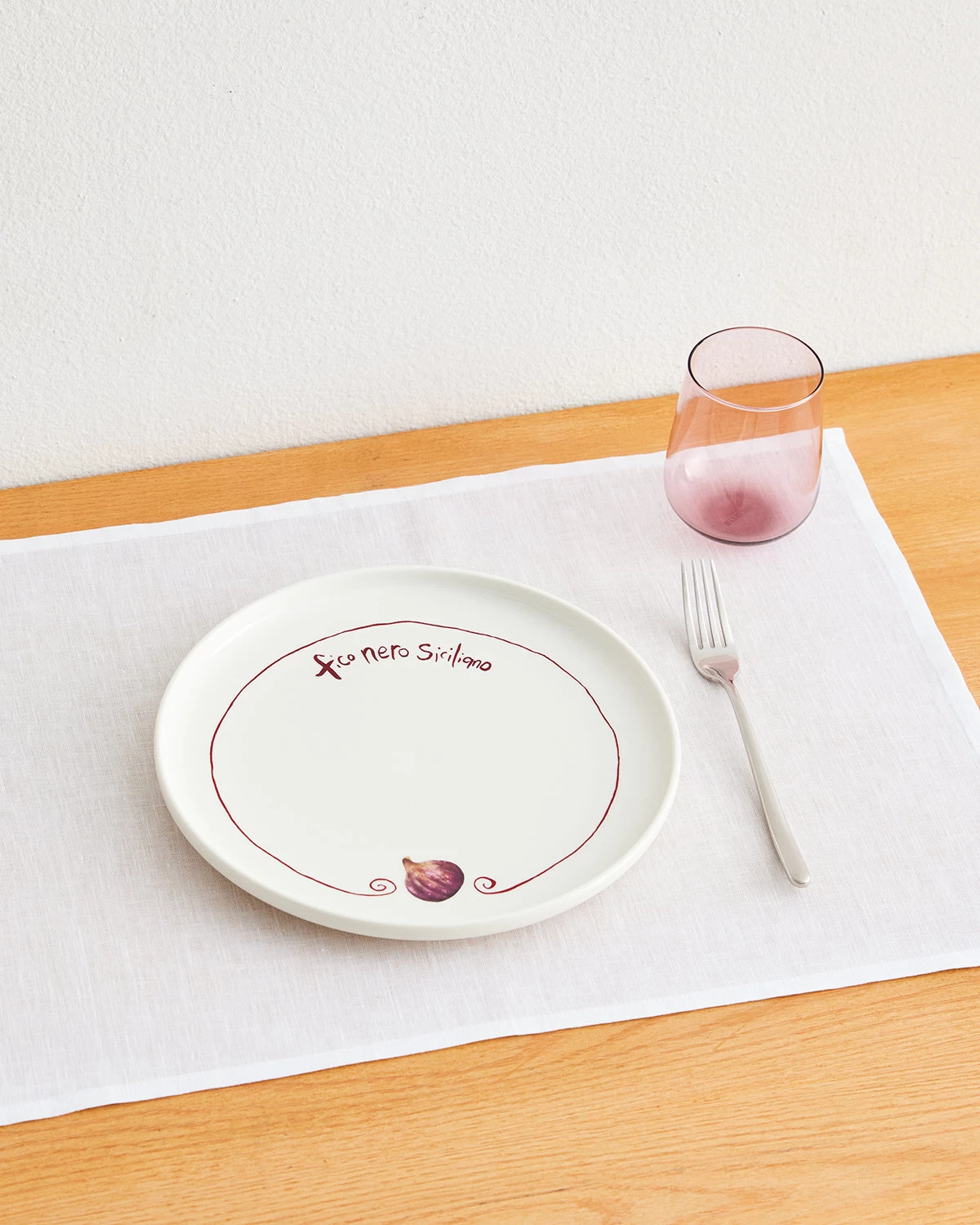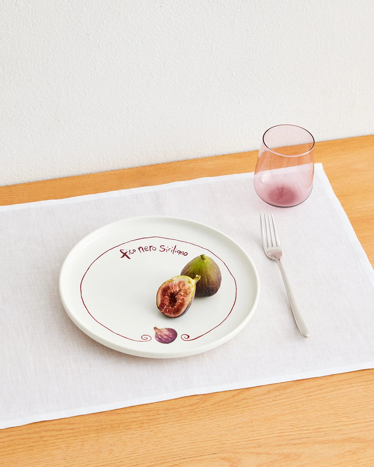 Fresh, plump and deliciously sweet, there’s something about figs that captures the imagination. The black Sicilian variety, in particular, was the muse for this Gemma Bamforth x Bed Threads dinner plate, featuring a ready-to-eat fig surrounded by a hand-drawn border and script in a matching deep purple hue. Collect all six Gemma Bamforth x Bed Threads plate designs for an effortlessly elegant dinner setting.