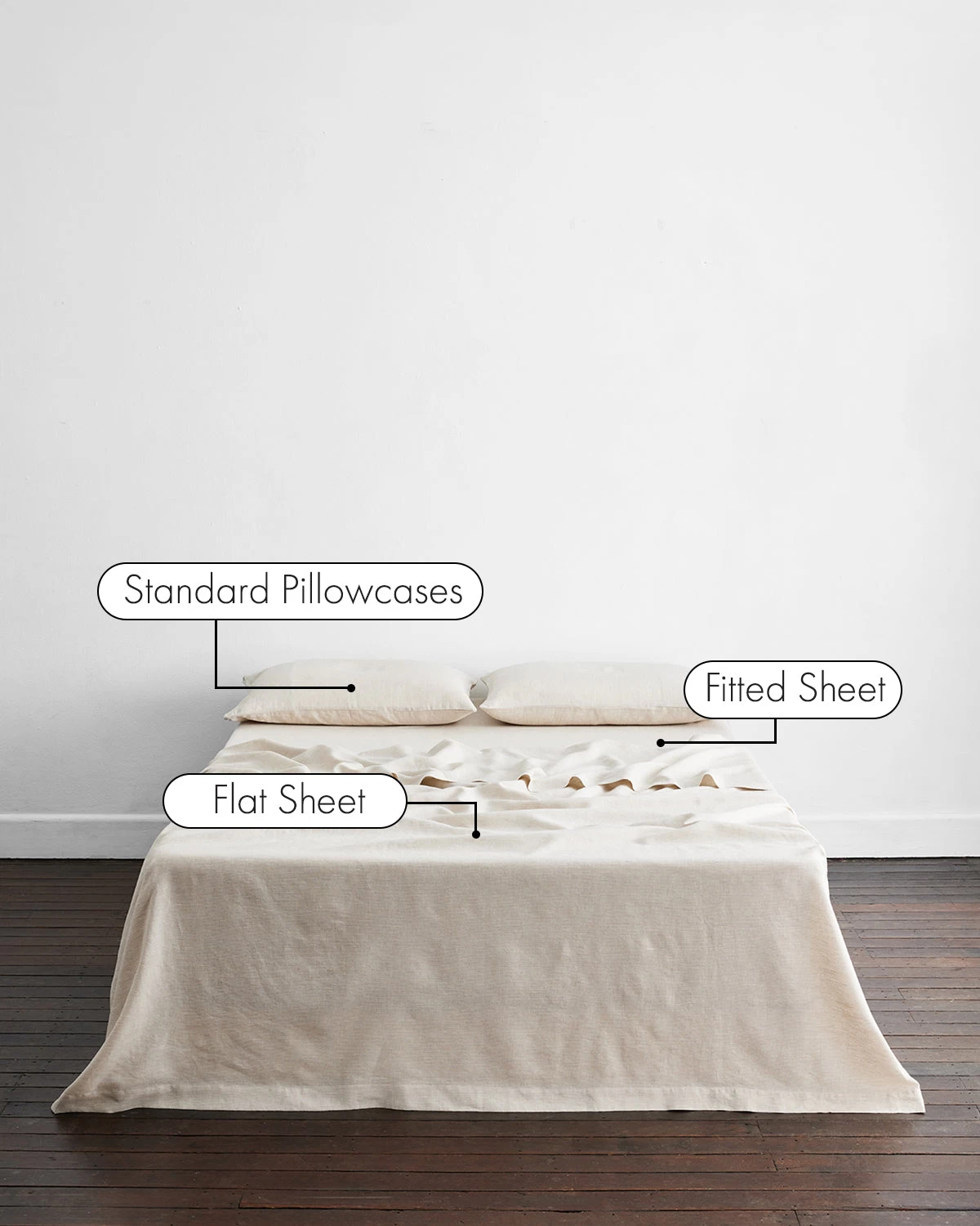 Buttery soft, pre-washed and designed to last, our 100% French flax linen sheet set inOatmeal & White Stripe includes two pillowcases, a flat sheet and a fitted sheet. Perfect for those who prefer to sleep without a duvet cover, or simply love a layered linen-clad bed.