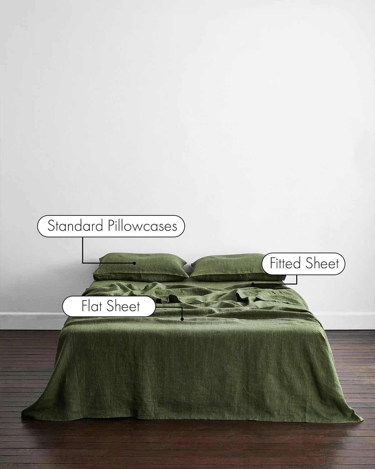 Buttery soft, pre-washed and designed to last, our 100% French flax linen sheet set in Olive Stripe includes two pillowcases, a flat sheet and a fitted sheet. Perfect for those who prefer to sleep without a duvet cover, or simply love a layered linen-clad bed.
