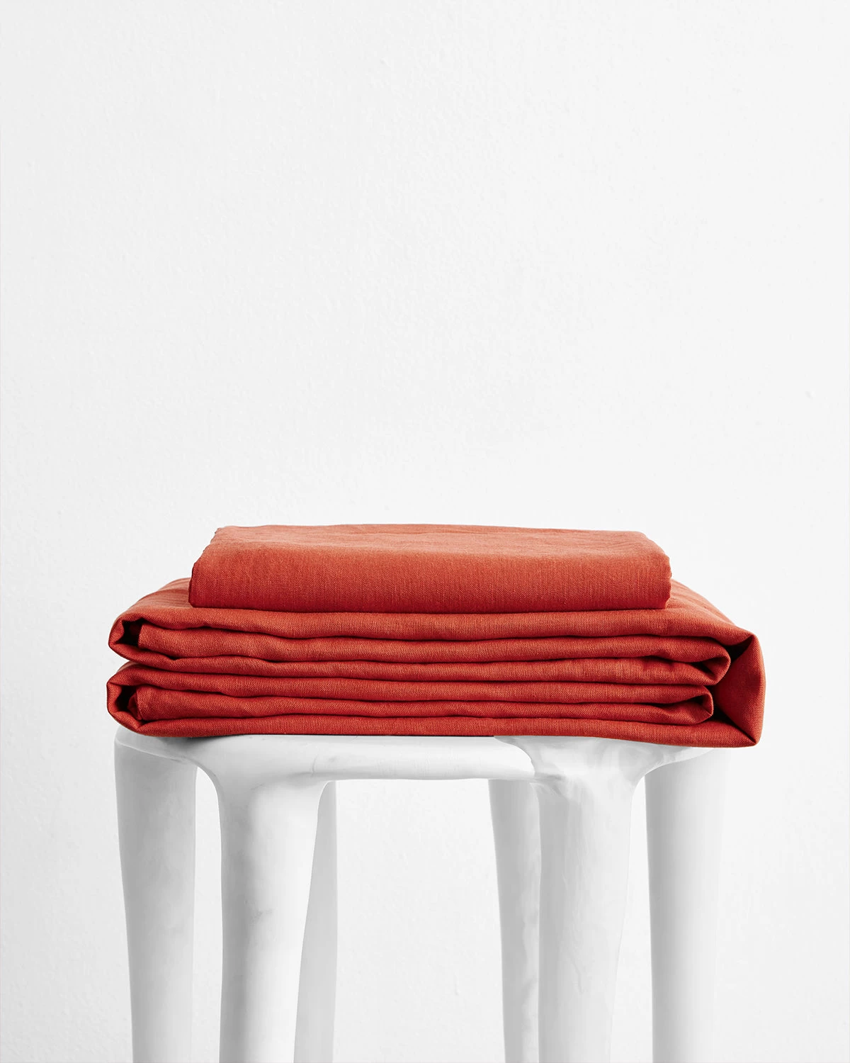 Buttery soft, pre-washed and designed to last, our 100% French flax linen sheet set inPaprika includes two pillowcases, a flat sheet and a fitted sheet. Perfect for those who prefer to sleep without a duvet cover, or simply love a layered linen-clad bed.