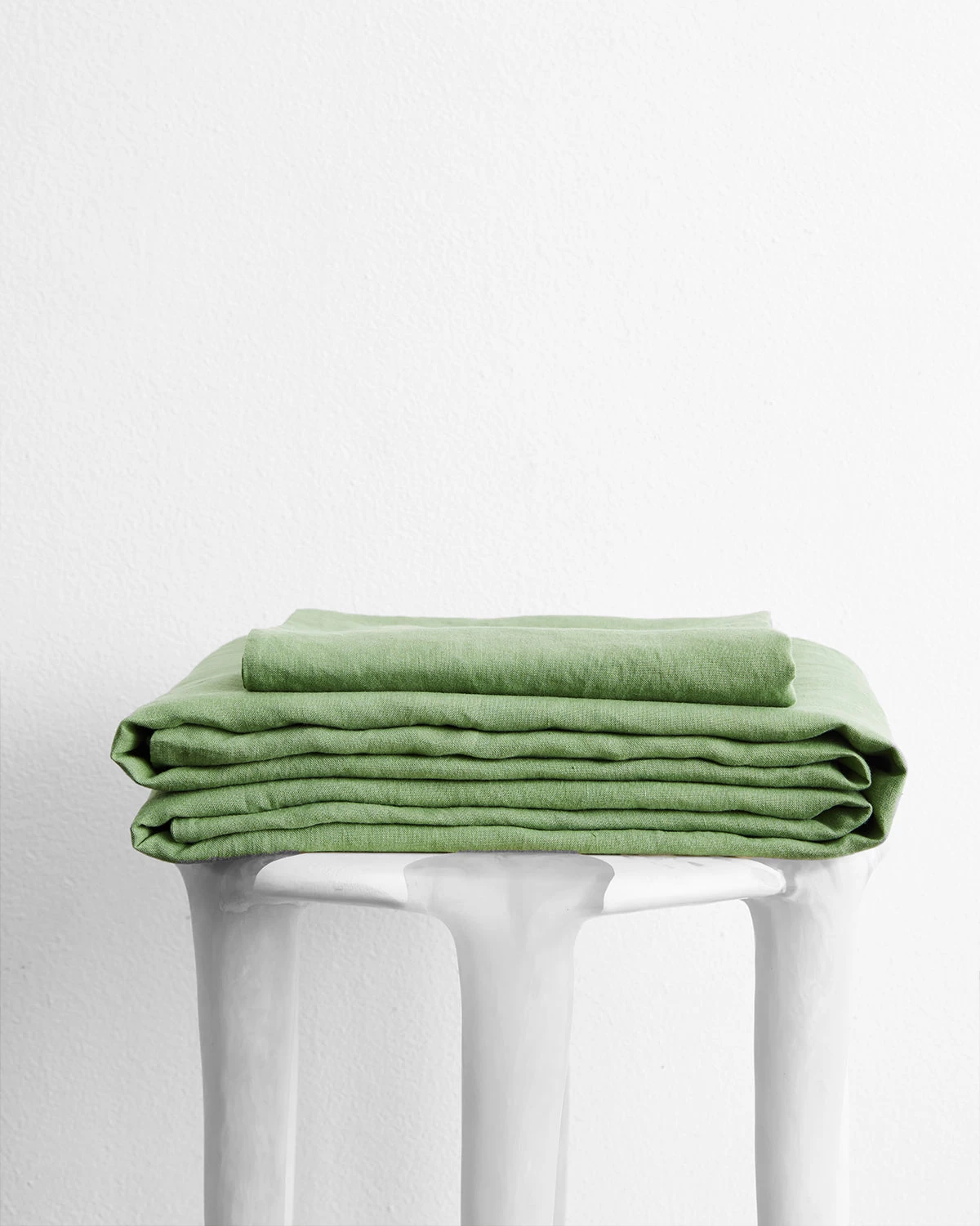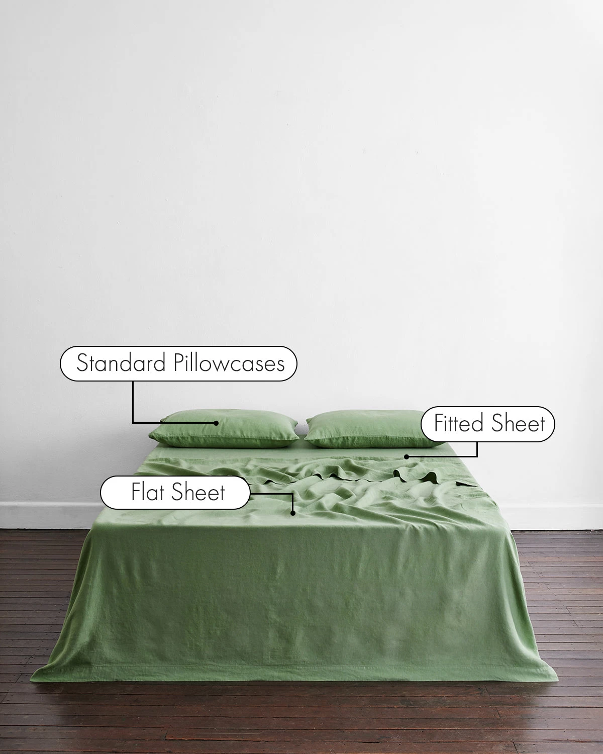 Buttery soft, pre-washed and designed to last, our 100% French flax linen sheet set inPistachio includes two pillowcases, a flat sheet and a fitted sheet. Perfect for those who prefer to sleep without a duvet cover, or simply love a layered linen-clad bed.