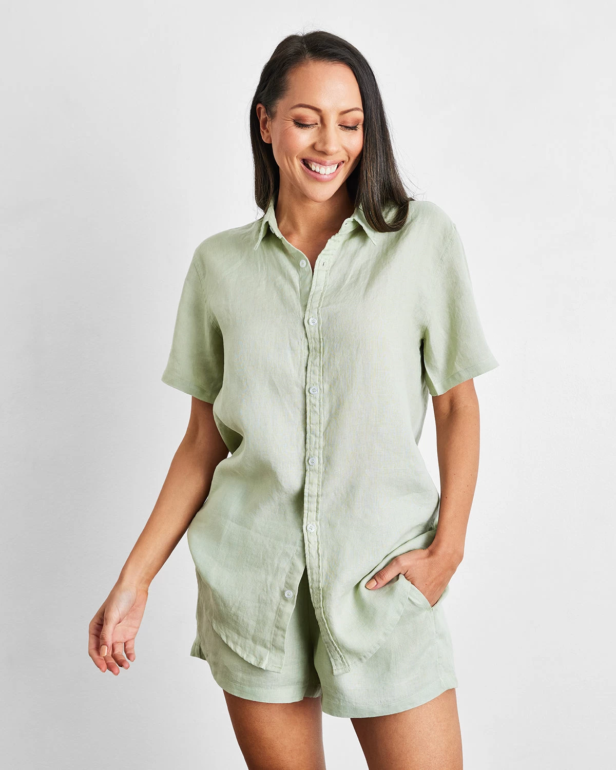 Our 100% French flax linen Sage Short Sleepwear Set will be your new wear-on-repeat wardrobe staple. This all-in-one set features a relaxed fit to keep you feeling cool under the covers, and looking cool out of them. With a moisture-wicking fabrication and coordinated color, our Short Sleepwear Set comes complete with a button-down Short Sleeve Shirt and matching pair of Shorts finished with an elasticated waist.