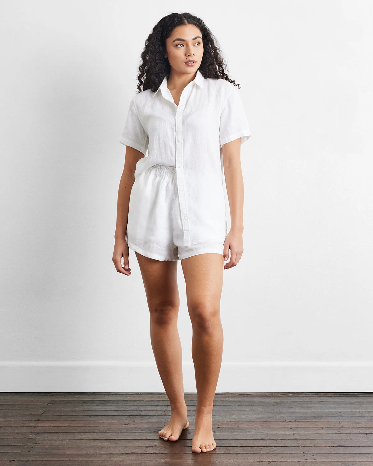 Meet your new loungewear must-have. Our 100% French Flax Linen Short Sleeve Shirt is just about the most comfortable way to spend your nights (and days). Featuring a relaxed fit and extended length that looks stylish tucked in or out, this effortlessly chic shirt will keep you cool under the covers thanks to its moisture-wicking fabrication and wide-fitting sleeves. Pair with our Linen Shorts for the ultimate summer set, or team this versatile essential with your favourite wardrobe staples.